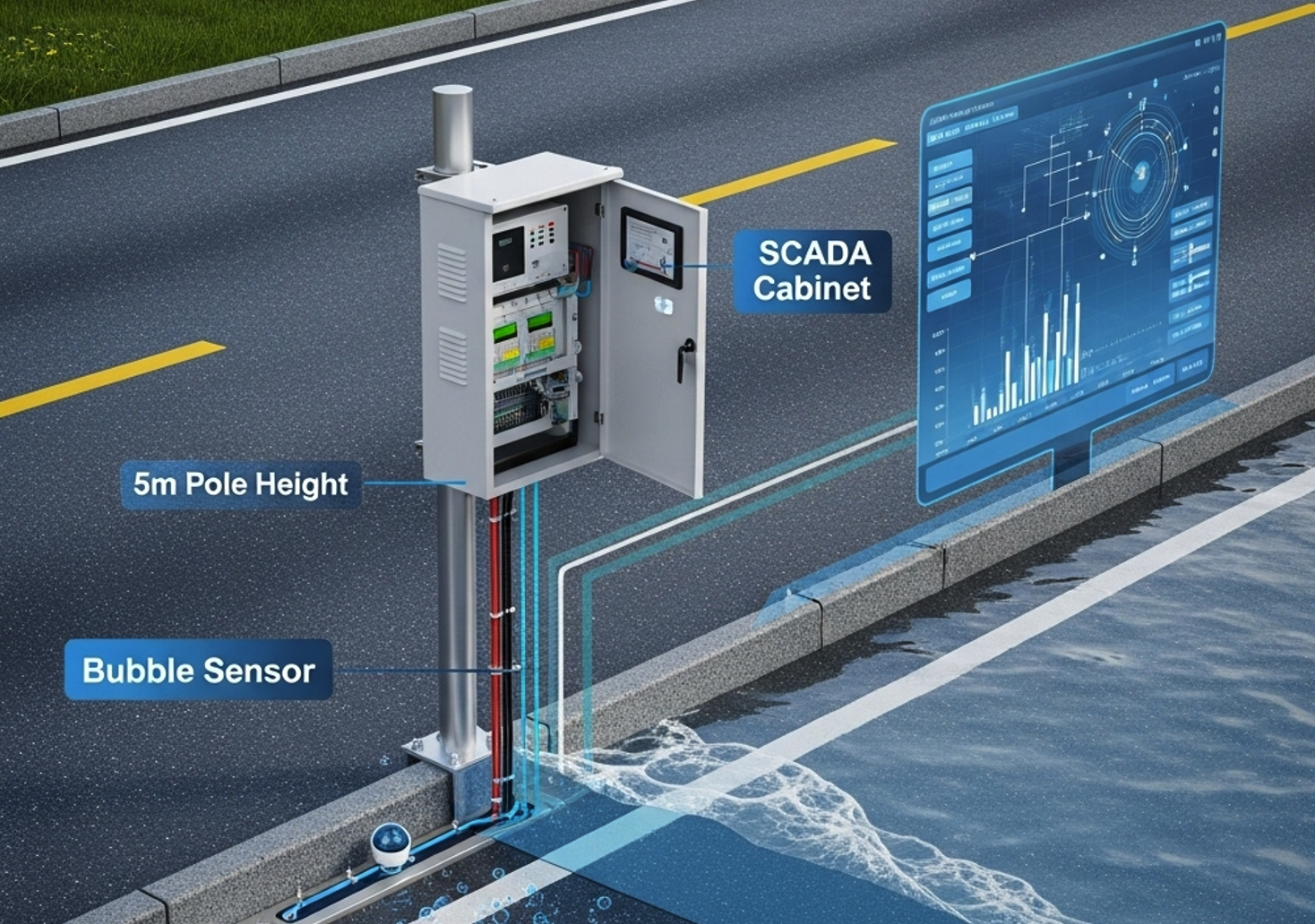 ระบบที่ใช้ในการตรวจจับและเฝ้าระวังระดับน้ำในพื้นที่ถนนที่เสี่ยงต่อการเกิดน้ำท่วม เพื่อป้องกันและลดความเสียหายจากน้ำท่วม โดยเฉพาะในพื้นที่เมืองที่มีการจราจรหนาแน่นและเสี่ยงต่อการเกิดอุบัติเหตุหรือความล่าช้าในการเดินทาง เนื่องจากน้ำท่วมถนน